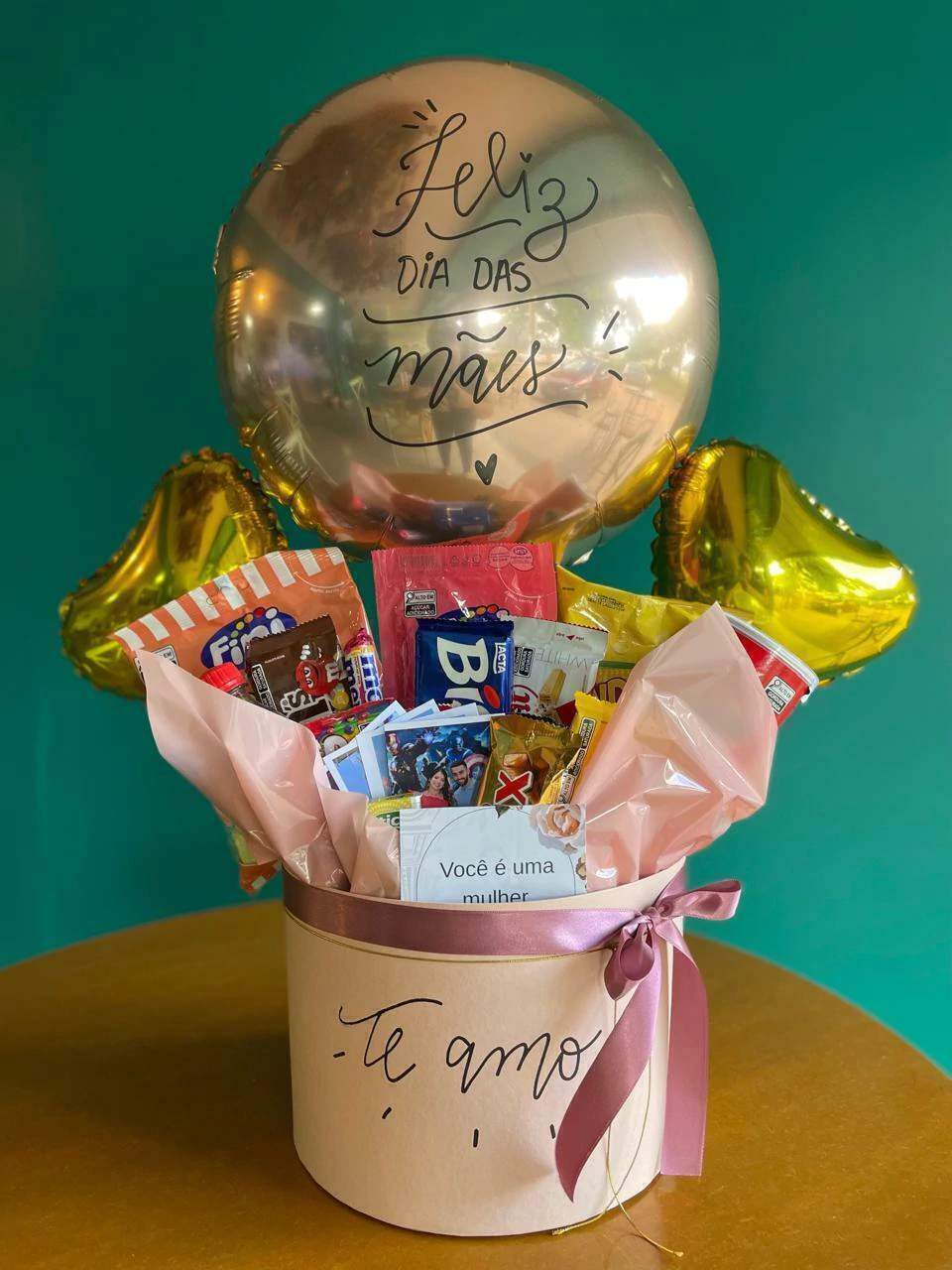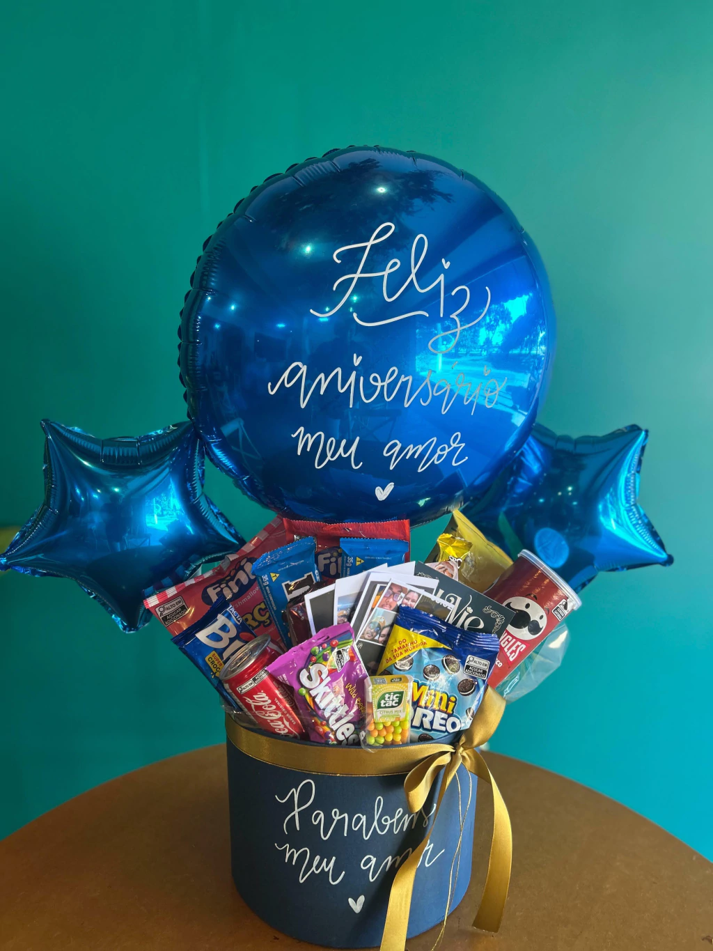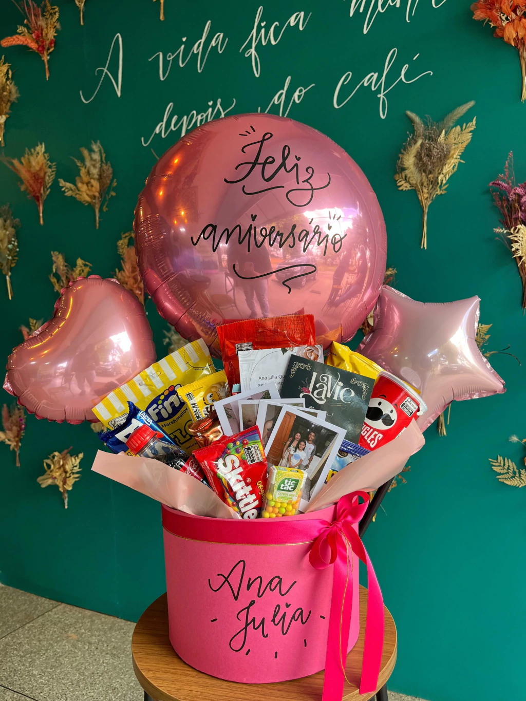 Todos os itens são organizados com cuidado em uma cesta personalizada, decorada com fitas e detalhes especiais. O balão personalizado completa o visual, trazendo um toque festivo e alegre. A cesta também pode incluir um cartão para mensagem.
